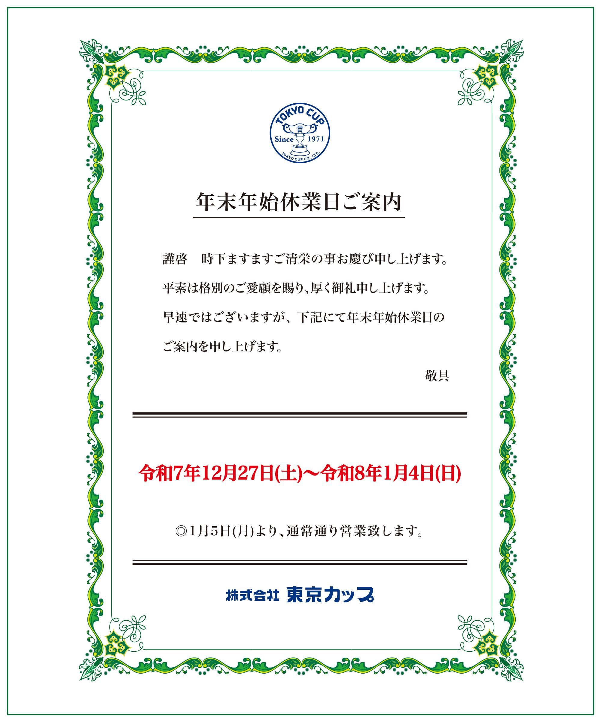 | ◾️ | 年末年始休業日のご案内:令和7年12月27日(土)〜令和8年1月4日(日)迄 |